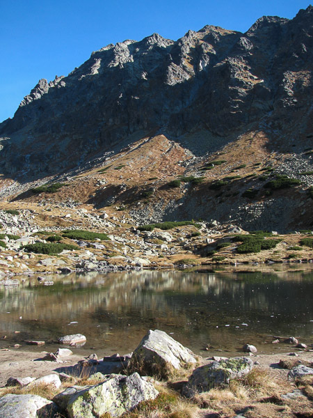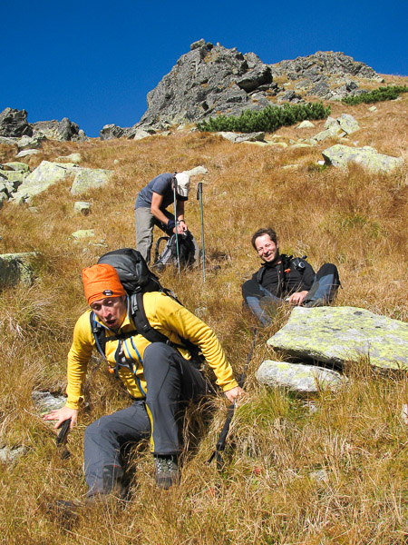 Peky je náš spoločný kamoš z vysokej školy. Kedysi sme ho volali Satan. Keďže sme sa dávno nevideli, rozhodli sme sa jeho narodky osláviť tatranskou túrou štýlovo - na diabolskom vrchole zvanom Satan.V silnej zostave - Vlado, Peky, Tulky a ja, sme sa vybrali zo Štrbského plesa do Mlynickej doliny. Studené ráno sa s príchodom prvých slnečných lúčov zmenilo na typicky teplé babie leto. Počasie na výstup bolo ideálne. Okrem nás mali vrcholové ambície aj ďalšie skupiny vysokohorských turistov. Tempo ani zďaleka nebolo ambiciózne, no neflákali sme to.